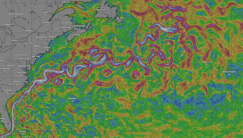 To, co na obrázku vidíte, je Golfský proud. Respektive jeho část daleko od pobřeží, někde jižně od Newfoundlandu. Golfský proud si představujeme jako řeku, která teče od amerických břehů k Evropě. Je to ale trochu složitější, Je to proud plný zákrut a vírů, které jsou na obrázku patrné. Jeho rychlost se místy šplhá i nad 3 uzle.