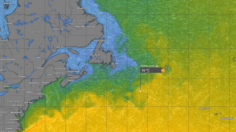 Přidali jsme ještě třetí obrázek. Ten již neukazuje proud, ale teplotu moře. Podíváte-li se k Newfoundlandu a Novému Skotsku, vidíte vodu o teplotě 0°C, kterou do oblasti přináší od severu ledový Labradorský proud. Stačí ale uplout jen 200 mil na jih a teplota moře již dosahuje přes 15°C. Díky Golfskému proudu.