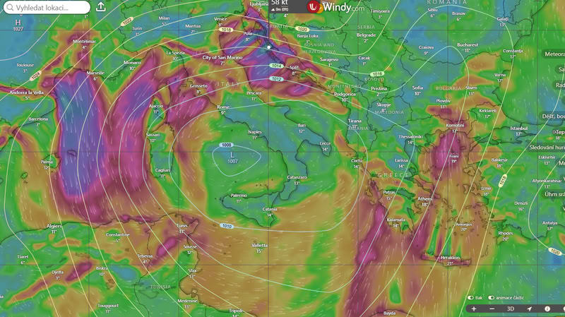 Kromě mapy větru nad Jadranem přidáváme celé Středomoří. Na obrázku je krásně vidět tlaková níže se středem nad Tyrhénským mořem a směr větru, který kopíruje směr izobar. Vítr se nad celým Středomořím stáčí stejně, jako se stáčí izobary. A protože jsme v níži, tak se vítr točí proti směru hodinových ručiček.