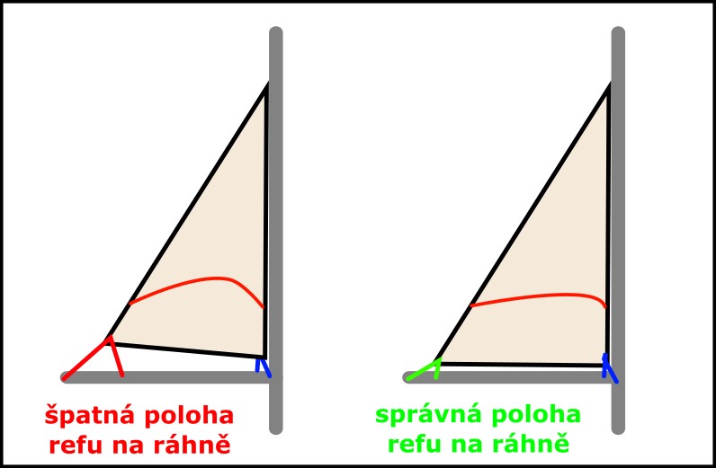 Je tu ještě druhý důvod, proč nejsme schopni plachtu vyploštit. Je to místo, kde je refovací lano uvázané na ráhně. Pokud je příliš vpředu, i při dotažení zůstane profil hluboký.
