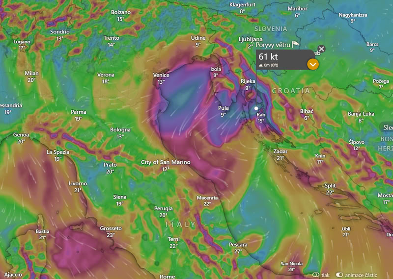 Tlaková níže na Jadranu, až 70 uzlů v poryvech