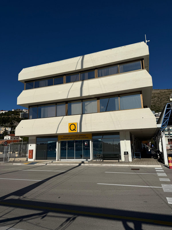V Dubrovníku v přístavu Gruž v budově se žlutým čtvercem a velkým Q šlo vše hladce. Nejprve kapitanát, kde jen okopírovali crew list, a pak policie s doklady. A celnice. Ta opět kopírovala ostošest. Vše ale šlo rychle, zdržel nás víc nákup chleba a vody. V Dubrovníku má úřad otevřeno nepřetržitě.