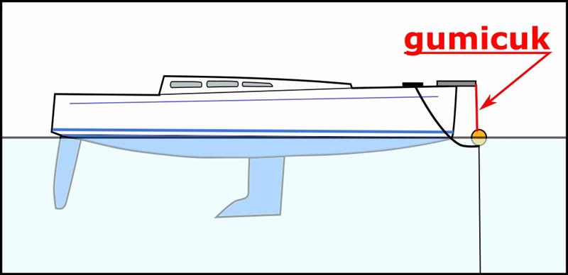 Stačí ale silnější gumicuk a noční klid je obnoven. Gumicuk protáhneme kotevním kováním na bóji a přišponujeme. Vyvazovací lana musí mít odpovídající délku, aby za větru jachta visela na lanech. Za bezvětří drží gumicuk bóji bezpečně daleko od přídě.