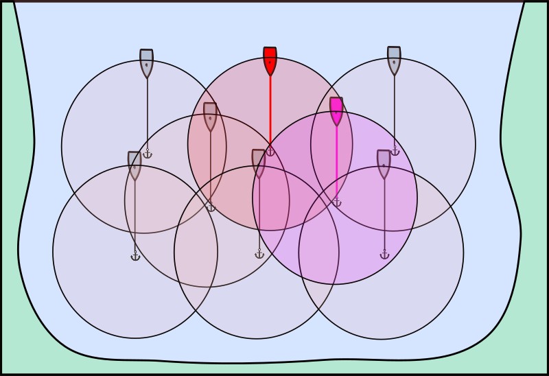 Fouká stabilní vítr, v zátoce je plno lodí a vy potřebujete zakotvit. Kde spustit kotvu, abyste byli ce nejdále od ostatních zakotvených jachet? Ideální je, spustit kotvu před spojnicí dvou lodí, které stojí před vámi (filalová jachta), případně přímo pod zádí lodě před námi (červená jachta). Tak máte zajištěno, že se ani při změnách větru nemohou vaše dvě jachty potkat.
