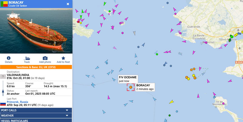 Tanker Boracay patřící k ruské stínové flotile, je podezřelý z dronových excesů nad dánskými letišti minulý týden. Francouzi loď o víkendu zadrželi nedaleko Saint-Nazaire.