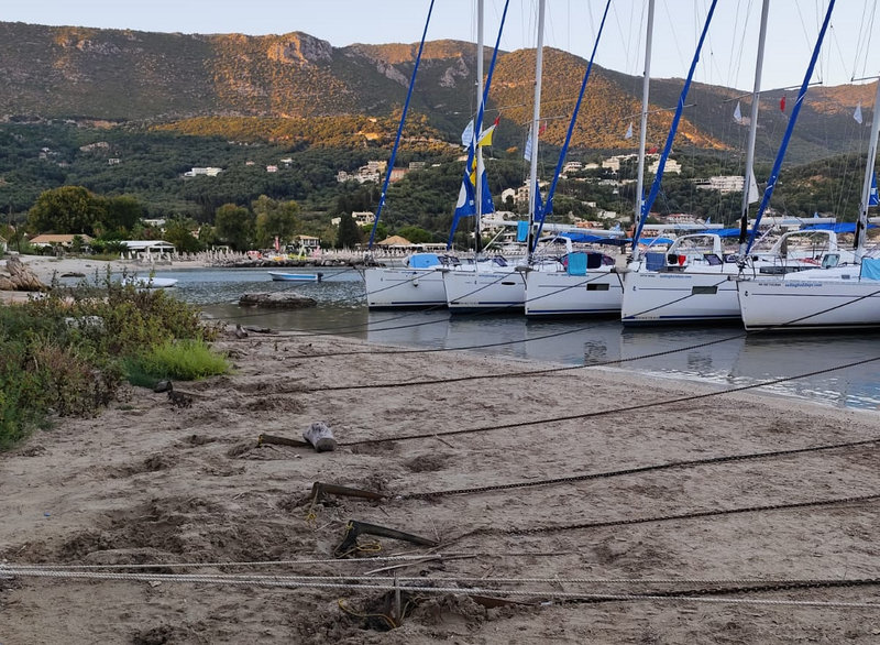 V Parze řeší stání tak, jak vidíte na snímcích. K tomu, aby bylo možné si něco takového dovolit, si musí být jistí počasím. Zároveň je dobré mít jistotu, že dno je písek a nic než písek. Aby jachta nenajela na kámen nebo betonový blok. Důležité také je, že s příďovou kotvou jim pomáhají vynést asistenti z charterové společnosti.