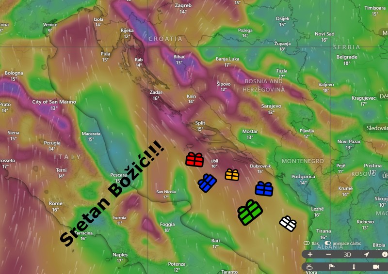 Jugo je větrem, který v zimním čase přináší do Dalmácie, dary. Je to taková zvyklost. Blíží se čas vánoční a dary se to jen hemží. Když je může nosit fousatý dědek se sobem, proč by je nemohl nosit jihovýchodní vítr?