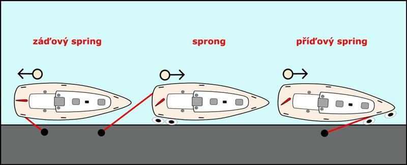 Zařadíme-li přední chod, jachta bude mít díky páce  stáčet na bok, kde je vyvázaný sprong. Je to dáno pákou mezi vazákem a lodním šroubem, který tlačí jachtu dopředu. Roh zádě u mola ale bude mít značnou tendenci se tlačit na molo. Máme tam sice fendry, je ale lepší si pomoci kormidlem. Stočíme-li kormidlo k molu, záď jachty bude proud vody od lodního šroubu tlačit od mola. Tlak na roh zádě u mola tak bude jen malý, pokud nějaký.