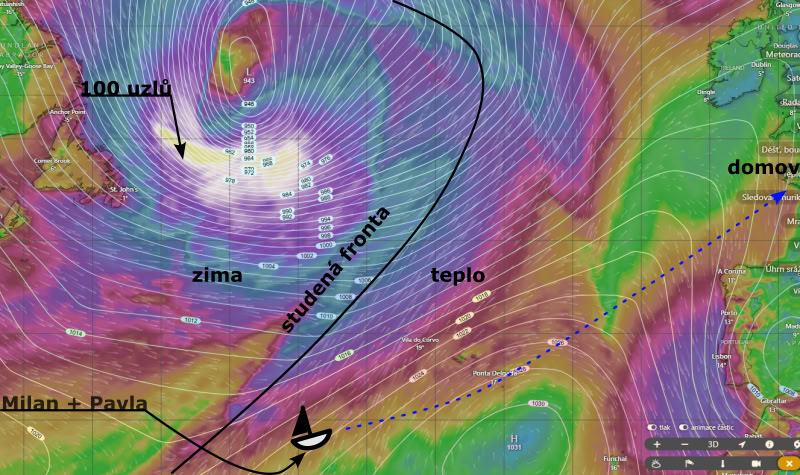 Oblast nejsilnějšího větru je daleko na severu. Našeho nejlepšího offshore jachtaře Milana Koláčka nezajímá tolik střed níže, jako studená fronta zasahující daleko na jih. Pluje z Karibiku do Evropy se svojí statečnou přítelkyní Pavlou. Je nedaleko Azor a frontou bude muset proplout. Zdá se, že vítr v poryvech bude foukat mezi 40 a 50 uzly. To je na pohodovou plavbu dost.