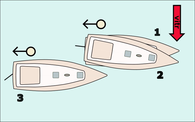 Couvání zádí k molu, především v bočním větru (1), je pro mnohé méně zkušené jachtaře noční můrou. Chybí-li vyježděnost, chybí i cit pro pohyb lodě, který je mimořádným pomocníkem.