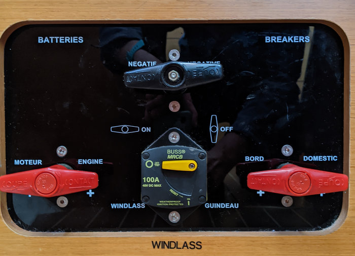 Obvykle v zadní kajutě najdete odpojovače akumulátorů. Jsou to nejčastěji červená téčka, ale mohou vypadat i jinak. Bývají tři. Mínus společný a plusy pro motor a druhý pro servisní okruh.