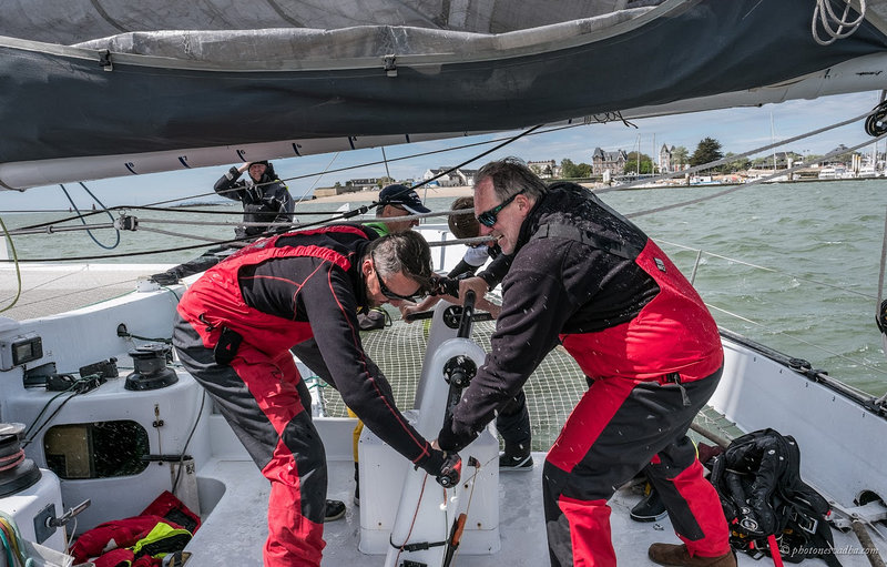 Taháme-li hlavní plachtu z kokpitu, obvykle to příliš rychlé nebude. Jeden člen posádky je ideální u stěžně, kde rychle tahá výtah, druhý v kokpitu co nejrychleji dobírá za vinšnou volné lano. Tak jsme schopni pracovat rychle.