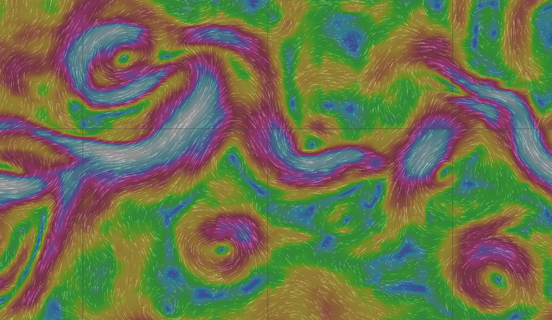 To, co na obrázku vidíte, je Golfský proud. Respektive jeho část daleko od pobřeží, někde jižně od Newfoundlandu. Golfský proud si představujeme jako řeku, která teče od amerických břehů k Evropě. Je to ale trochu složitější, Je to proud plný zákrut a vírů, které jsou na obrázku patrné. Jeho rychlost se místy šplhá i nad 3 uzle.