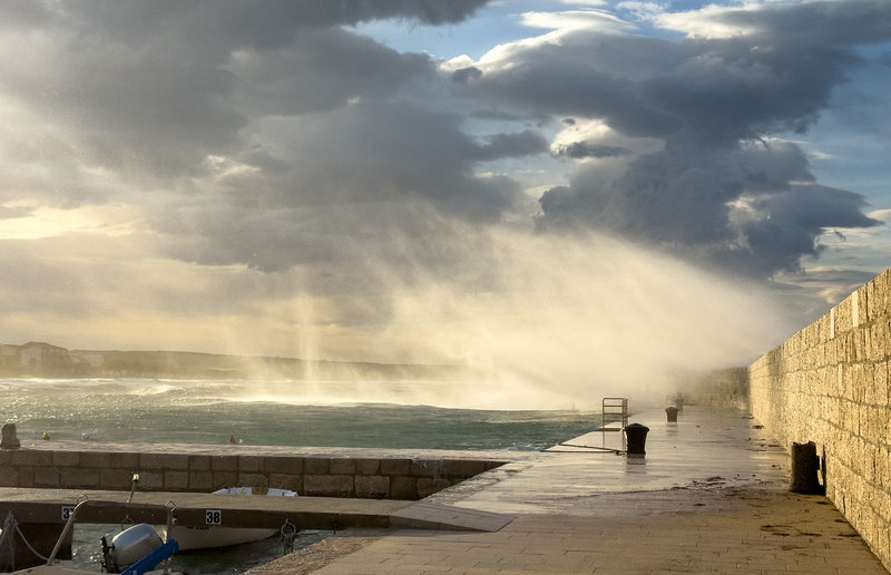 Zajel si na Paški most. Byl samozřejmě zavřený, stejně jako dálnice A1 ze Záhřebu do Zadaru. Během pár minut, co na mostě byl, naměřil nejvíce 93 uzlů větru. To je vítr, který většina z nás nikdy nezažila. Další záběry jsou z Ražanacu, přístavu přímo pod Velebitem. Vlny se tu nemají kde rozjet, přesto jsou vysoké a samozřejmě strmé.