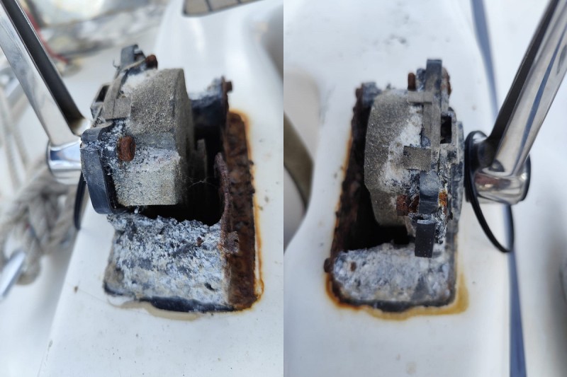 Fotografie drobné závady nám poslal skipper Pavel Janeček. Na jachtě je už druhý týden. Jméno jachty je Paxos a je z Gouvie na Korfu. Na fotografiích to nevypadá moc dobře, ale jsem přesvědčen, že se najde nějaký elegantní způsob, jak tuto drobnost snadno a levně opravit.